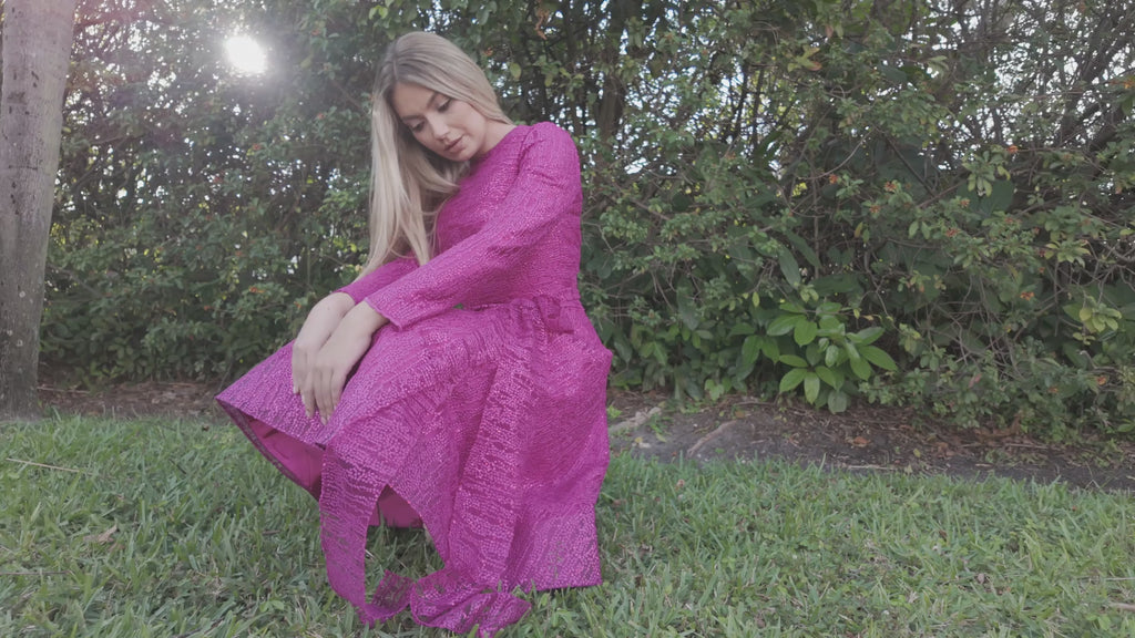 Elegant Midi Dress in Magenta Thread-Dot Tulle, this midi-length dress features a voluminous skirt crafted in black thread-dot tulle. The bodice is sleek and fitted, designed with a subtle cisal neckline and long sleeves for an effortlessly graceful look. A matching waistband accentuates the silhouette, finished with a charming bow detail at the waist.